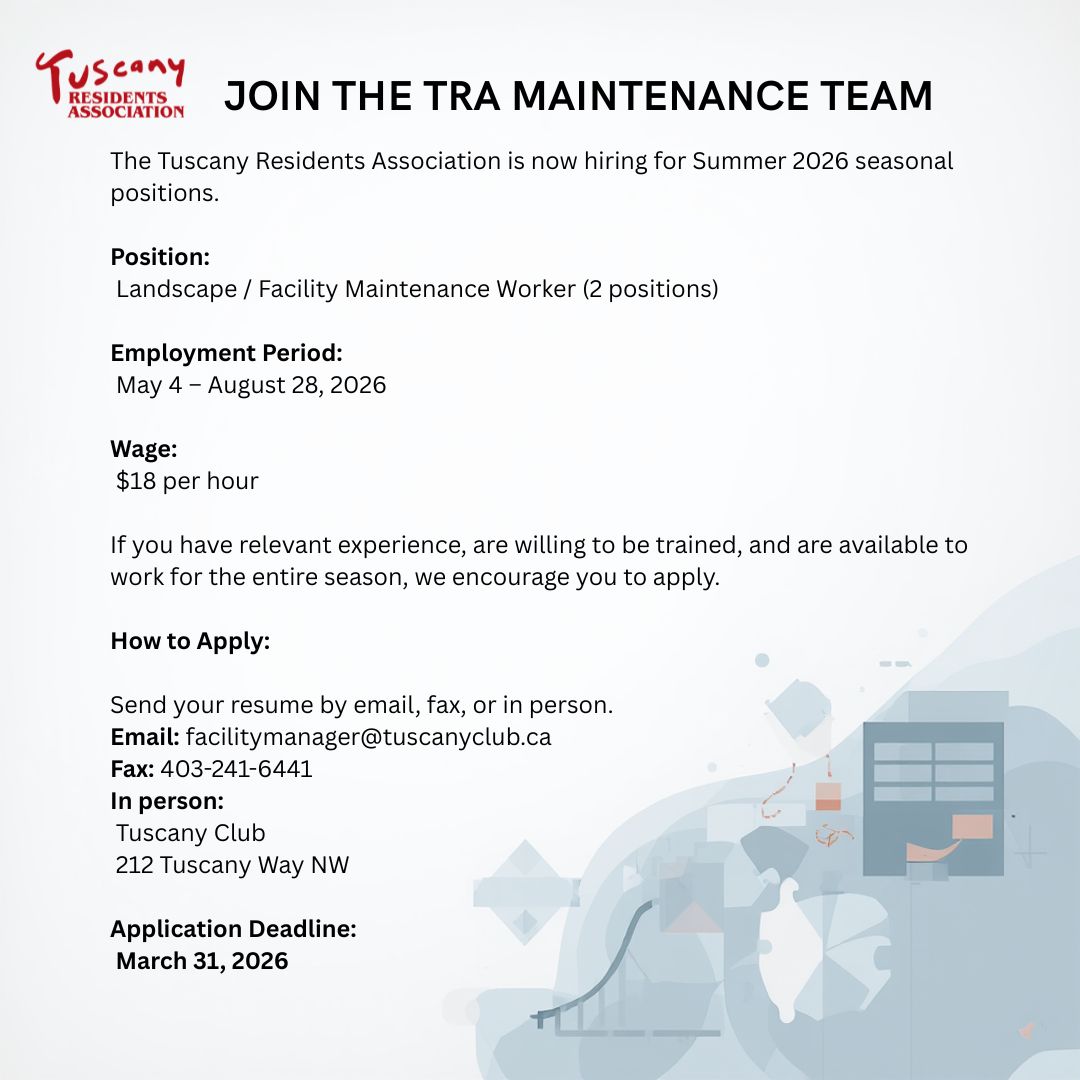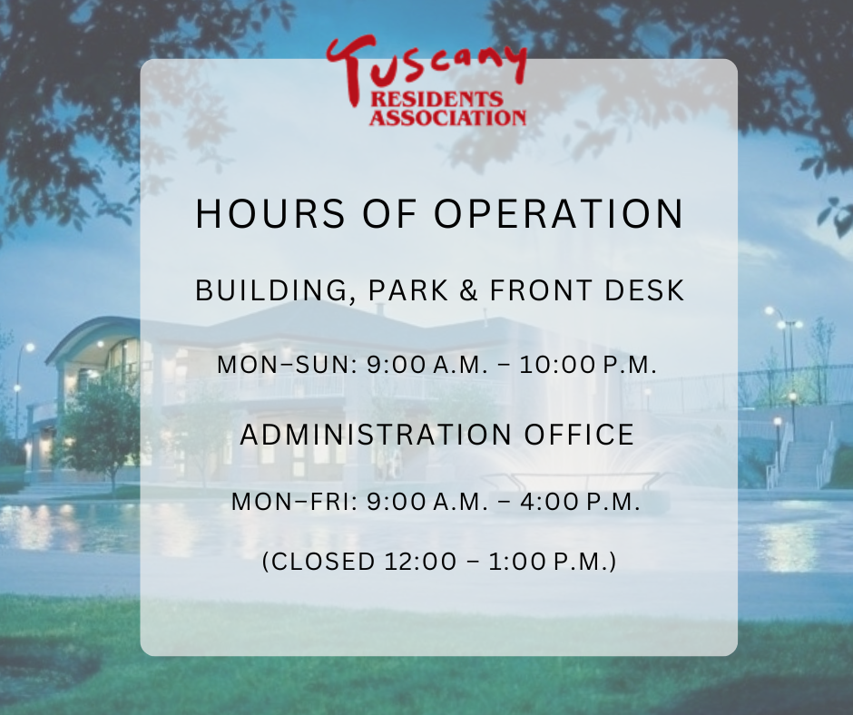 A reminder that only Tuscany Residents who have paid their TRA Membership fees will be permitted to access the facility and its amenities or register for programs.